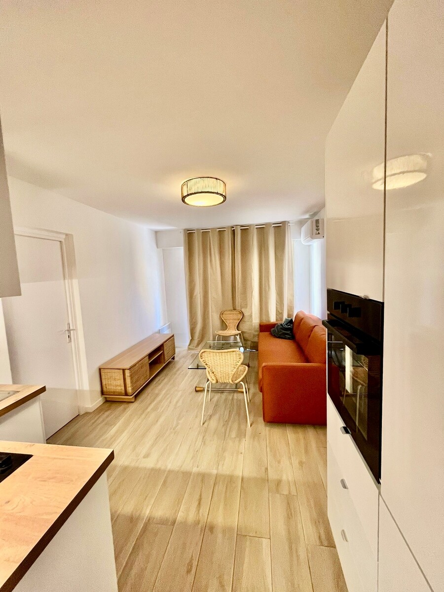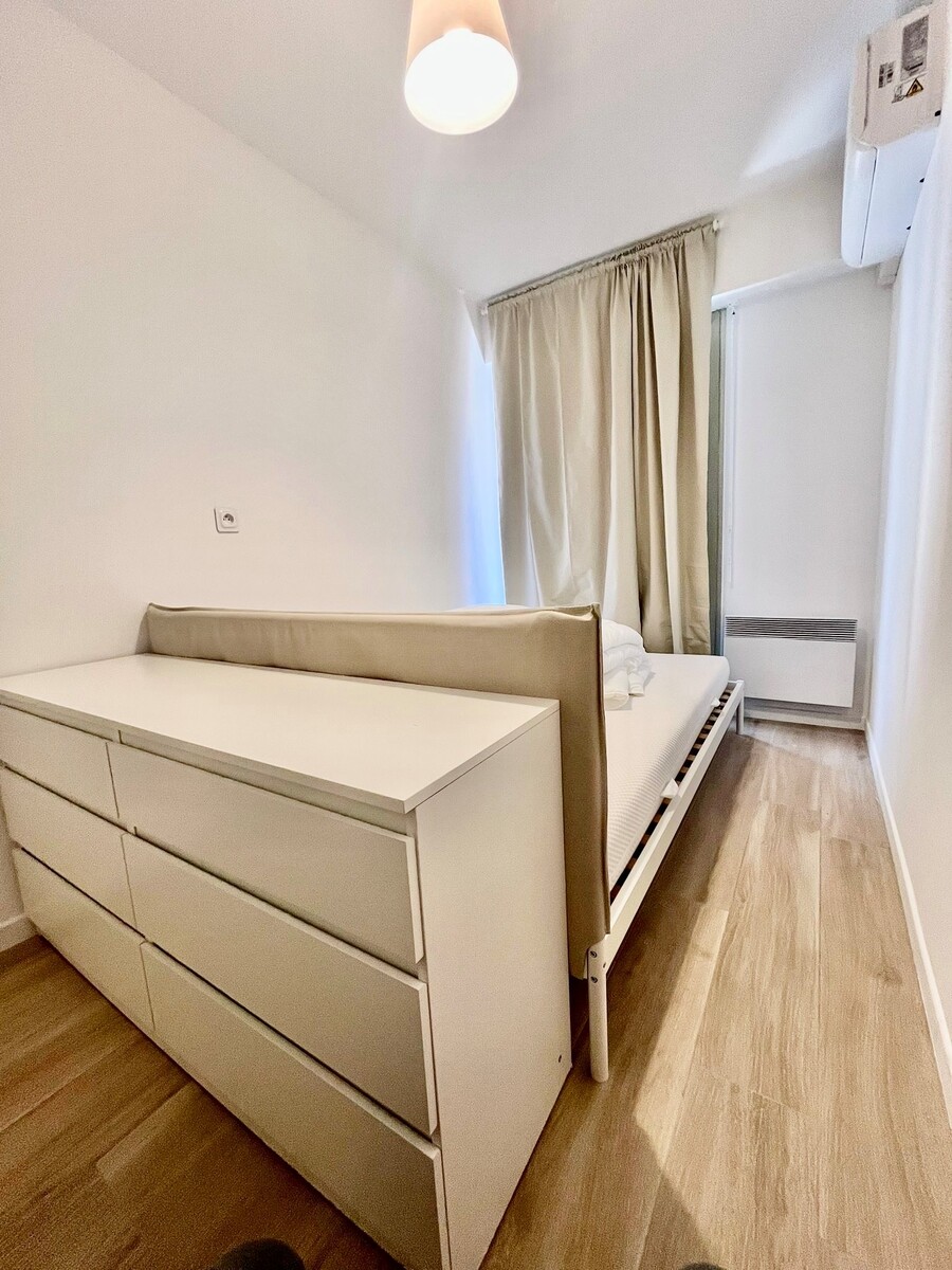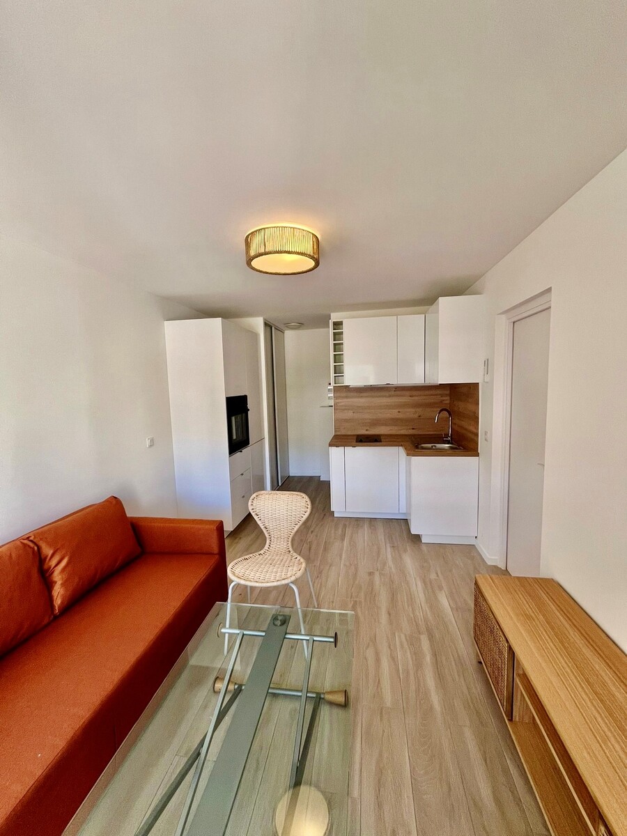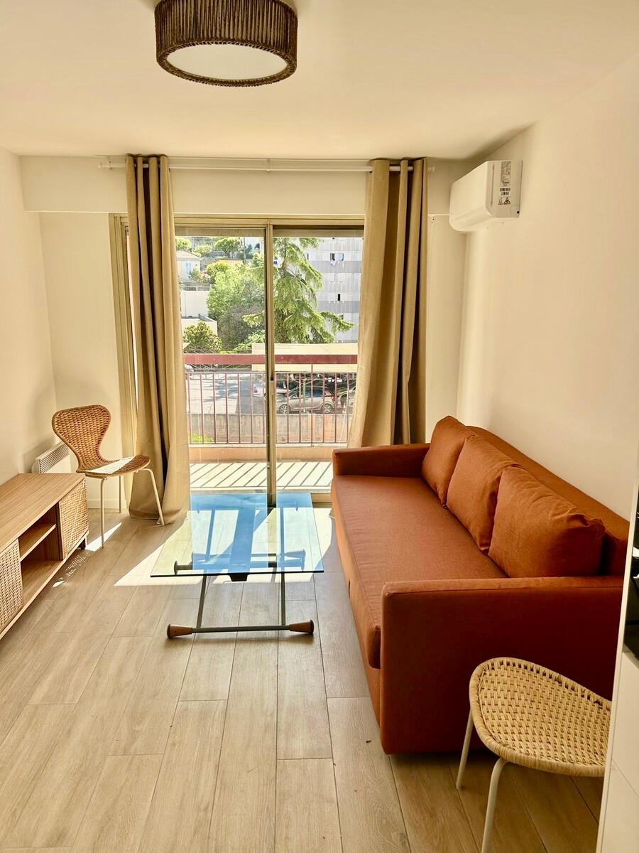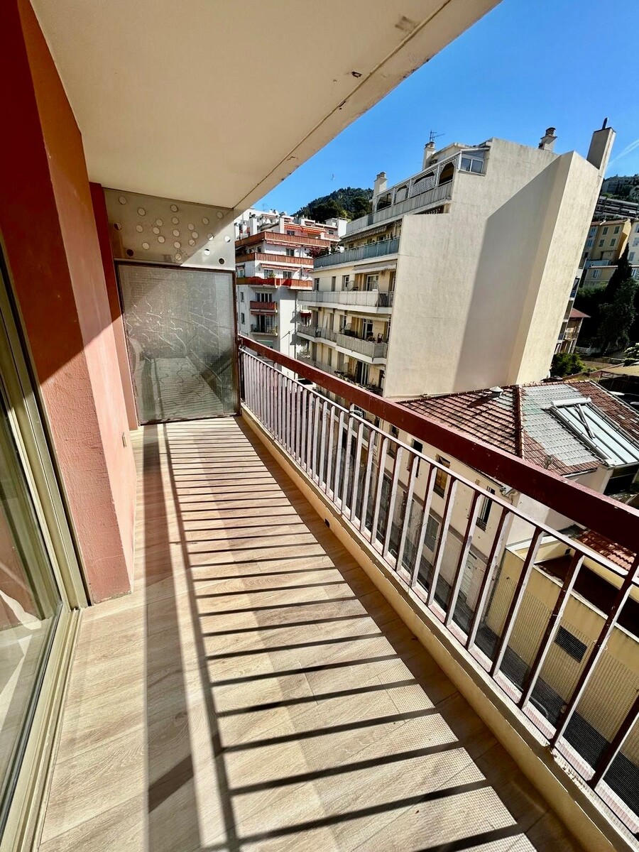 A LOUER NICE RIQUIER, a quelques pas de la gare SNCF, dans rue calme et immeuble bien entretenu au 4ème étage avec ascenseur cet appartement a fait l'objet d'importants travaux de rénovation. Il comprend une entrée avec placard, un séjour avec cuisine ouverte, une salle de douche avec WC, une pièce de 7,36m2 aménagée en chambre à coucher et une belle et spacieuse terrasse exposée EST avec vue dégagée sur la colline du Mont Alban. Climatisation réversible, beaucoup de rangements, calme. Une petite cave complète le bien. Tout beau, tout neuf !